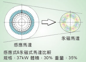 ![]() 馬達(dá)使用永磁型轉(zhuǎn)子,不須通過(guò)電流製造磁場(chǎng)除耗能更低外,電機(jī)內(nèi)部產(chǎn)生廢熱也減少,散熱需求面積減少,馬達(dá)體積減少30%,重量減輕35% |